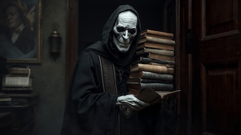 The Quill Phantom drifts in wearing scholarly robes and carrying a stack of dusty tomes.